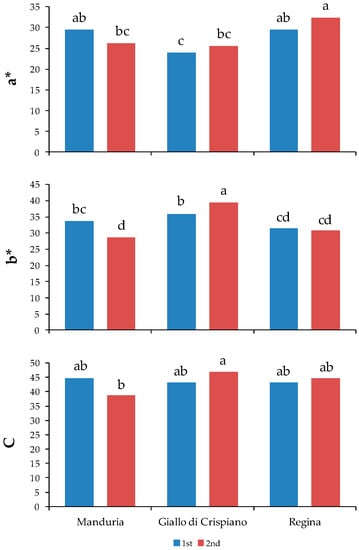 Generally, Giallo di Crispiano landrace showed the highest lightness value and for all three landraces this parameter was higher at the 2nd harvest than at the 1st one (Table 2). Regarding hue angle, Giallo di Crispiano showed a higher value than Manduria and Regina landraces. The highest a* values were found in Manduria at the 1st harvest and in Regina at both harvests, while the highest b* value was found in Giallo di Crispiano at the 2nd harvest. Regarding C value, the unique real difference was between Manduria and Giallo di Crispiano, both at the 2nd harvest (Figure 2).
