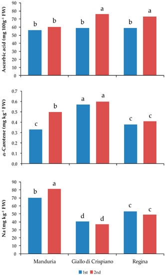 Content of ascorbic acid (p ≤ 0.01), α-Carotene (p ≤ 0.05) and sodium (p ≤ 0.05) in tomato fruits of three genotypes at two harvest time: (1st) 7th, 14th and 20th July 2016, respectively for Manduria, Regina and Giallo di Crispiano; (2nd) 14th and 20th July and 4th August 2016, respectively for Manduria, Regina and Giallo di Crispiano. Different letters indicate significant differences at p = 0.05.