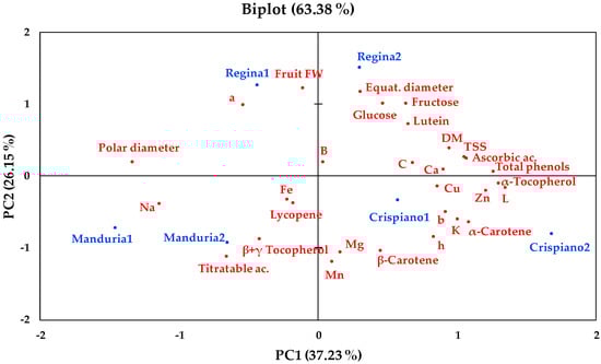 The PCA allowed to separate distinctly Regina from the other two landraces, since they are collocated on the two opposite sides of the PC2. Fruit weight and equatorial diameter together with glucose and fructose and a* parameter resulted positively correlated with PC2; while Mg and Mn, titratable acidity and β-Carotene were negatively correlated with PC2. Actually, Regina showed the highest values of the first group of parameters and the lowest values of the second group, compared to the other landraces (Table 2, Table 3, Table 4, Table 5 and Table 6). In addition, Manduria and Giallo di Crispiano were associated with the negative and positive sides of PC1, respectively. L* parameter, α- tocopherol, total phenols were highly positively correlated with PC1, together with, α-Carotene, ascorbic acid, TSS, Zn and K (Figure 4). At the same time, Na and fruit polar diameter were highly correlated with the negative portion of PC1, influencing Manduria landrace (Figure 4).