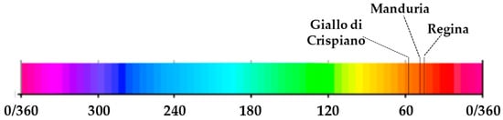 Carotenoids are lipophilic pigments, providing orange, yellow, red and purple colors in fruits and vegetables, that are known to possess a good antioxidant activity against free radicals []. β-Carotene is one of the predominant carotenoids in tomato and represents an important compound for human health, being the precursor of the vitamin A [,]. The content of β-Carotene in tomatoes is 3–6 mg kg−1 FW in salad tomatoes and 2–4.5 mg kg−1 FW in processing cultivars []. Our results show that all three landraces can be considered as a good source of β-Carotene. Moreover, it is interesting to note that the highest β-Carotene content observed in Giallo di Crispiano, not only positively influences its nutritional profile, but it is also important to increase the visual quality trait such as color. Indeed, color is one of the most important quality attribute of fruits and vegetables, influencing consumers’ choice and preference []. Regarding tomato, it is well known that the wide range of red color in ripe fruits is mainly due to the synthesis of lycopene and β-Carotene in different proportion. Since β-Carotene pigment is responsible for the orange color in fruits and vegetables [] and considering that lycopene content did not differ among the three genotypes (Table 5), our results suggest that the higher β-Carotene content in Giallo di Crispiano might be the reason why it is perceived as less “red” than the other landraces. This is confirmed by CIE Lab color analysis, considering that hue angle value was higher in Giallo di Crispiano than in the other landraces (Table 2). Hue angle is considered the “qualitative” attribute of color, according to which colors can be traditionally defined as reddish, greenish, etc. []. A hue angle value of 0 or 360 represents red hue, whilst hue angle values of 90, 180 and 270 represent yellow, green and blue hues, respectively. Thus, on the basis of the graphical representation of hue angle for the three tomato landraces (Figure 5) it is possible to better understand that Giallo di Crispiano landrace can be considered less “red” than Manduria and Regina.