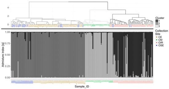The population analysis confirmed the results obtained previously with the hierarchical cluster analysis (Figure 2). Using 10 independent iterations for each possible number of clusters from 1 to 10, the mean value of the log-likelihood function used to estimate the best partition reached the maximum result at a number of clusters equal to 3, with values of = 89.36. The results of the analysis were extrapolated from the software and imported into R to generate the genetic admixture (q) plot keeping each labeled individual sorted by collection site. Again, the samples of the CE and the CM collection sites are included in clearly distinct genetic clusters, as well as those of the OIR collection site, where, however, a small number of individuals with a mixed cluster membership of clusters 2 and 3 is included, as also reported in the dendrogram. Also, in the STRUCTURE analysis, the samples belonging to the OSE collection site show a greater genetic similarity to those of the CE collection site.