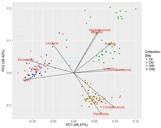 The biochemical data were subjected to PCA in order to highlight the meta-variables that were useful for the discrimination of samples. The first two PC axes explain a total of about 75% of the variation (relative weights of PC1 and PC2 in Table S6) and allow the samples to be clustered into at least three macro-groups (Figure 3). We observed that one of the groups is dominated by CE samples, another by CM samples, while the last group mostly contains samples from OIR and OSE collection sites. Such results confirmed, as also showed by the Kruskal–Wallis test, that the biochemical profile allows the origin of samples to be clearly discriminated, and the PCA allows fatty acids composition of each sample to be characterized.