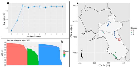 Panel plot for the cluster analysis performed on the first two PCs calculated on the fatty acids dataset. It is reported the number of clusters that maximize the value of the gap statistic (a), the individual silhouette of each cluster the average silhouette as a measure of cluster internal accuracy (b) and the cluster membership of each sampled tree reported on the geographic basis (c). Cluster n° 1 (red color) contains all samples of the CE collection site and samples OIR73 and OIR74; cluster number 2 (green color) contains 32 out of 33 samples of the CM collection site and samples OIR2 and OIR4; cluster number 3 (blue color) contains all samples of the OSE collection site, 44 out of 48 samples of the OIR collection site and sample SM5.