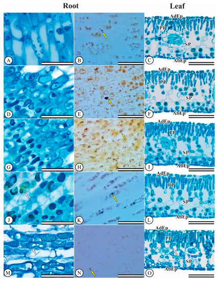 Eugenia dysenterica root and leaf anatomy after 20 days of growth at various Al concentrations. (A–C) control treatment, (D–F) 200 μmol L−1 Al3+, (G–I) 400 μmol L−1 Al3+, (J–L) 600 μmol L−1 Al3+, (M,N,O) 800 μmol L−1 Al3+. (AdEp) adaxial epidermis. (AbEp) abaxial epidermis. (PP) palisade parenchyma. (SP) spongy parenchyma. (A,B,D,E,G,H,J,K,M,N) root meristem and differentiation zone. (C,F,I,L,O) leaf mesophyll cells. White arrows indicate the production of phenolic compounds and yellow arrows indicate starch accumulation. (First column) Scale bar = 50 μm. (Second and third columns) Scale bar = 100 μm.