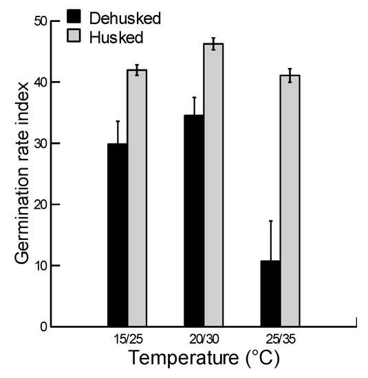 2.3. Effect of Husk and Temperature on Germination Rate Index