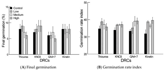 - Khan, M.A.; Shaikh, F.; Zehra, A.; Ahmed, M.Z.; Gul, B.; Ansari, R. Role of chemicals in alleviating salinity and light related seed dormancy in sub-tropical grasses. Flora 2017, 233, 150–155. [Google Scholar] [CrossRef]