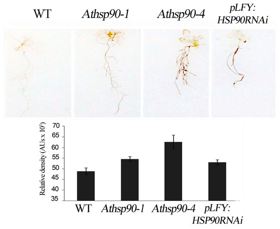Under normal conditions, PA back-conversion catalyzed by PAOs leads to H2O2 production balancing the intracellular oxygen consumption rate [38]. In order to examine whether HSP90s modulate H2O2 production, the in situ semi-quantitative method based on staining with 3,3’-diaminobenzidine (DAB) was employed. We found that all 15 day-old Athsp90 and pLFY:HSP90RNAi seedlings had increased H2O2 content compared to WT seedlings, as assessed by DAB staining (Figure 2). Hydrogen peroxide levels paralleled the increased S-PAs titers, which are substrates of PAOs; the pLFY:HSP90RNAi line as well as the Athsp90-1 and the Athsp90-4 young seedlings, which contained the highest S- and acetyl-PAs, exhibited the highest H2O2 levels compared to WT (Figure 1A and Figure 2). These results further point to a certain correlation between HSP90s, PAs, and PAO-generated H2O2.