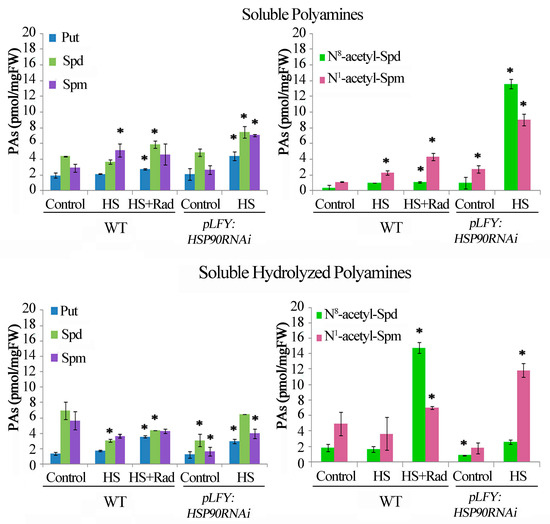 Since HS induces transcription of the HSP90 genes [12,13,16], it was of interest to assess whether genetic depletion of HSP90 1–4 genes by RNAi [22] or pharmacological inhibition of HSP90 in WT Arabidopsis plants would similarly affect PA homeostasis under HS conditions. Thus, analysis of PA titers was performed in leaves of WT and pLFY:HSP90RNAi transgenic plants following acute HS (1 h at 42 °C) in the presence (in WT) or absence (in pLFY:HSP90RNAi) of radicicol (Rad), a specific inhibitor of HSP90 activity. In WT, HS resulted in increased S-Spm, and considerable decrease of SH-Spd and SH-Spm levels (Figure 3). Soluble-Spm is a common thermo-responsive indicator and has been proposed as a marker of thermotolerance [65]. The combined effect of HS + Rad resulted in increased S-Put, S-Spd, SH-Put, SH-Spd and SH-Spm when compared to HS treatment alone. In the WT, the S- N8-acetyl-Spd and N1-acetyl-Spm titers were slightly affected by HS, whereas the inhibition of HSP90 by Rad resulted in significant increase of the N-acetyl-PAs in both fractions S and SH (Figure 3). Similarly, genetic depletion of cytosolic HSP90s in the pLFY:HSP90RNAi line resulted in a significant increase of all S-PAs, SH-PAs as well as of S-acetyl-PAs and SH-acetyl-PAs under HS. In particular, S-Spd in pLFY:HSP90RNAi showed a nearly 3-fold increase (Figure 3). These data indicate that impairment of the HSP90 molecular chaperones, when coupled to the stimulatory effect of the HS-related pathway, increases further the deregulation of PA homeostasis and leads to a significant increase of acetylated PAs.