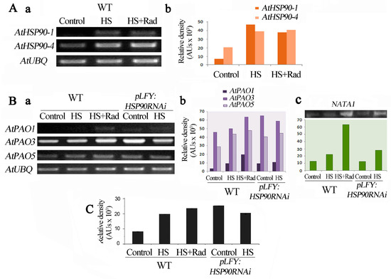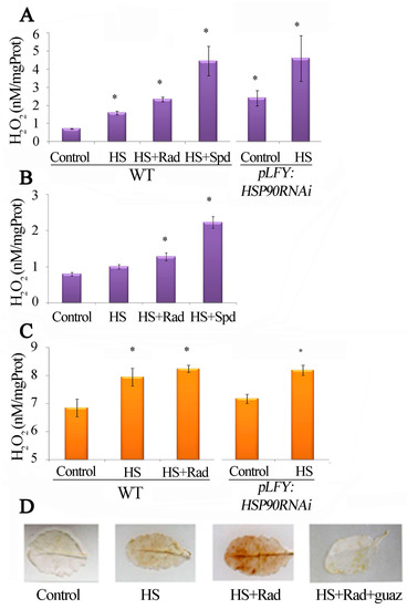 The drastic reduction of HSP90s results in deregulation of PA titers and induction of the PAO pathway, which generates H2O2. In WT, the pharmacological inhibition of HSP90s under HS induces expression of AtPAO genes, suggesting that HSP90s may be implicated in a way to decelerate the action of PAOs into the cell. Indeed, the pLFY:HSP90RNAi line exhibits elevated endogenous AtPAO mRNA levels similar to those in WT when treated with HS + Rad, suggesting that biochemical inhibition of HSP90s defines a favorable endogenous potential of PA oxidation (Figure 4 and Figure 5).