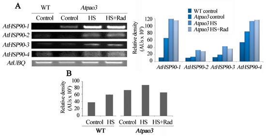 To examine whether PAO homeostasis has an impact on AtHSP90 expression, Atpao3 loss-of-function plants were tested. By applying HS to leaves incubated in MES medium, transcript analysis revealed that only AtHSP90-1 and AtHSP90-4 mRNAs were increased in the Atpao3 mutant compared to WT. The abundance of AtHSP90 1–4 mRNAs as well as HSP90 protein were analyzed in the Atpao3 mutant and the WT, under HS (Figure 6A,B). In the Atpao3, mRNA titers of the AtHSP90-1 and AtHSP90-4 were significantly greater compared to WT, whilst HS resulted in an obvious increase of the mRNA levels of the AtHSP90 1–4 genes (Figure 6A). Inhibition of HSP90 activity simultaneously to HS stimulation (HS + Rad) exerted no further significant effect on the AtHSP90 1–4 mRNA levels (Figure 6A).