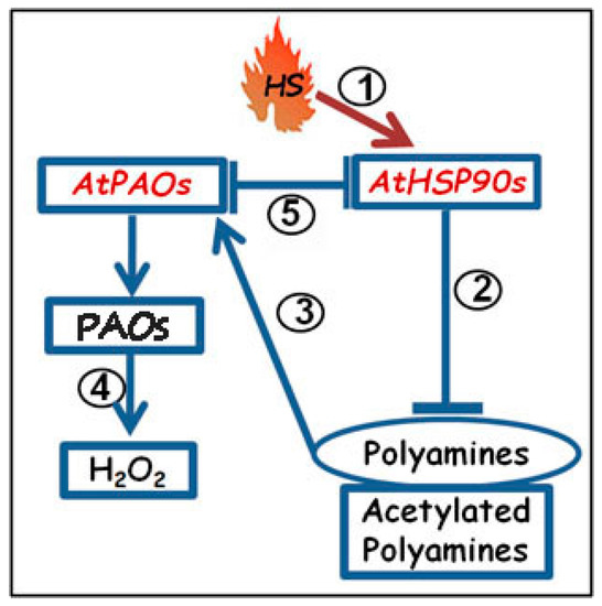 Taken all together, these results reveal a mutually antagonistic HS-regulated effect involving HSP90s, PAs, PAOs and H2O2 in Arabidopsis thaliana.