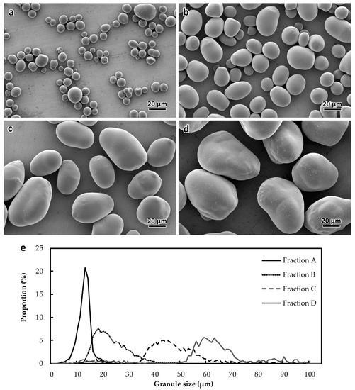 - Wang, C.; Tang, C.-H.; Fu, X.; Huang, Q.; Zhang, B. Granular size of potato starch affects structural properties, octenylsuccinic anhydride modification and flowability. Food Chem. 2016, 212, 453–459. [Google Scholar] [CrossRef] [PubMed]