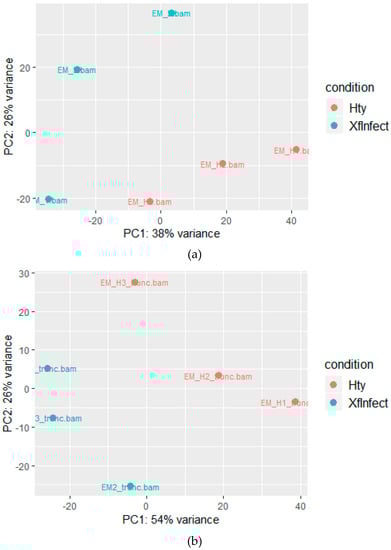 Relationships among plants status (i.e., infected and healthy) and biological replicates were exemplified by principal component analysis (PCA), which clearly separates Xf-infected from healthy plants (Figure 2a). Principal Component 1 and 2 respectively represent 38 and 26% of the total variance, showing a compact clustering of healthy plants and a wider distribution of the three infected plants.