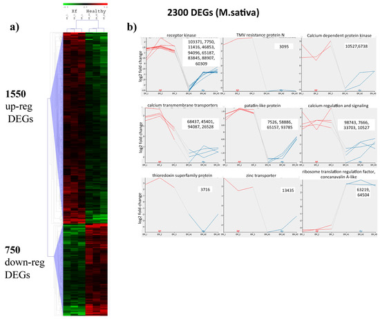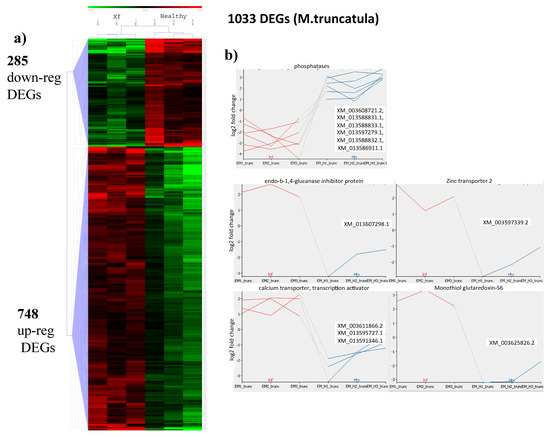 Differential gene expression analysis was also carried out on the assembled genome of M. truncatula, which is used to facilitate studies on legume species [15]. As expected, a lower number of reads, from 35.8 to 39.1% of the total, were mapped to the M. truncatula genome, with respect to those aligned to the M. sativa transcriptome (Table S1, M. truncatula). Relationships among libraries and consistency of the replicates was shown by PCA in which Principal Component 1 and 2 respectively explain 54 and 26% of the total variance and clearly distinguish healthy from Xylella-infected plants (Figure 2b). Among the 57,585 mRNAs (XM_#) annotated in the MedtrA17_4.0 version of the M. truncatula genome (ftp://ftp.ncbi.nlm.nih.gov/genomes/all/GCF/000/219/495/GCF_000219495.3_MedtrA17_4.0/GCF_000219495.3_MedtrA17_4.0_genomic.gff.gz), a total of 1033 mRNAs were found differentially expressed by DESeq2 analysis and were distinct in 748 up- and 285 downregulated whose minimum and maximum log2 fold change were −4.67 and +3.49, respectively. Only DEG >+1 and <−1 are considered for further analysis (Figure 4a and Table S2, M. truncatula).