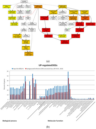 Gene ontology analysis was performed by the AgriGov2 gene analysis tool, which supports the Medicago truncatula genome assembly (http://systemsbiology.cau.edu.cn/agriGOv2/) [40]. Singular enrichment analysis (SEA) tool identifies GO-enriched terms that are statistically significant (p < 0.05) with respect to a pre-calculated background of terms. GO enrichment studies were also performed by Parametric Analysis of Gene Sete Enrichment (PAGE) that includes the gene expression levels expression (log 2 fold change) in the analysis.