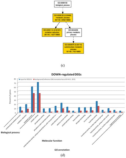 GO analysis by SEA. Graphical representations of biological and metabolic processes showing enriched GO terms among the Medicago truncatula upregulated (a) and downregulated (c) transcripts obtained by SEA analysis. Statistical significance (p < 0.05) is indicated by p-values of each term (p < 0.05) and the color (i.e., from yellow to red the significance increase). Graphs showing the 57 upregulated (b) and 18 downregulated (d) GO terms detailed by biological process and molecular function. Enriched DEGs (blue bars) are compared to the background expression (red bars) of the M. truncatula V4.0 (JCVI) as a reference genome.