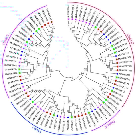To explore the evolutionary relationships of SWEET family genes, we performed phylogenetic analysis by aligning SWEET protein sequences from Arabidopsis, sorghum, cucumber, and M. truncatula (Figure 1). In this analysis, these SWEET proteins were clearly divided into four clades (I, II, III and IV), which was in accordance with previous phylogenetic classifications of SWEETs [55]. Among them, clade III contained the largest number of MtSWEETs (10), while clade IV possessed the fewest MtSWEETs (only MtSWEET16), and clades I and II each contained seven MtSWEETs (Figure 1, Table 1).