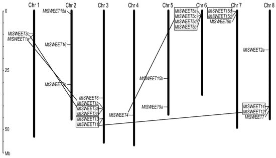 Locations and duplications of MtSWEET genes on M. truncatula chromosomes. The black lines indicate segmentally duplicated genes, and the tandemly duplicated genes are boxed. The scale is provided in megabase (Mb).