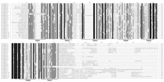 The predicted results of TMHMM Server v. 2.0 suggested that most of the MtSWEET proteins contain seven TMHs, except for MtSWEET2b, MtSWEET4, and MtSWEET11 (Table 1, Figure S1). MtSWEET4 and MtSWEET11 had six TMHs, which was also observed in some SWEET members of cucumber [35] and soybean [11]. Interestingly, MtSWEET2b contained 15 TMHs (Figure S1) from the duplication of 7-TMHs, which was similar to the duplication of semiSWEET (3-TMHs) to evolve into SWEET (7-TMHs) [11,12], implying that it is an extraSWEET.