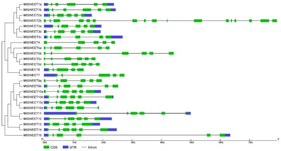To further examine the structural features of MtSWEET genes, the gene structures of all MtSWEET genes were determined by comparing the CDS and the gDNA sequences. As shown in Figure 4, the vast majority of MtSWEET genes (20/25) contained five introns; four MtSWEET genes (MtSWEET4, MtSWEET6, MtSWEET7 and MtSWEET13) harbored four introns, while MtSWEET2b possessed 16 introns. In addition, genes clustered together generally exhibited similar gene structures. For example, three pairs of MtSWEET genes, MtSWEET6 and MtSWEET7, MtSWEET1a and MtSWEET1b, MtSWEET15a and MtSWEET15c, had similar exon numbers and lengths. These results indicated that the gene structure of the MtSWEET family members is highly conserved.