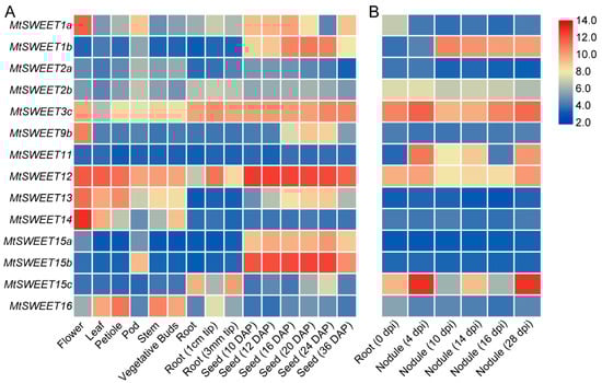 The expression profiles of the MtSWEET genes in different developmental stages/tissues were examined based on the microarray data from M. truncatula. Eleven MtSWEET genes (MtSWEET3a, MtSWEET3b, MtSWEET4, MtSWEET5a, MtSWEET5b, MtSWEET5c, MtSWEET5d, MtSWEET6, MtSWEET7, MtSWEET9a, and MtSWEET15d) did not have corresponding probe sets in the dataset. We then the examined the expression patterns of the rest fourteen MtSWEET genes. As shown in Figure 5A, nearly all the MtSWEET genes (with the exception of MtSWEET11) were expressed in at least one of the tested tissues (flower, leaf, petiole, pod, stem, vegetative buds, and root). Among these genes, some exhibited relatively higher expression, such as MtSWEET3c, MtSWEET12, MtSWEET13, MtSWEET14, and MtSWEET16. In addition, some MtSWEET genes displayed obviously high expression levels in only one single tissue. For example, MtSWEET1a, MtSWEET9b, and MtSWEET14 were preferentially expressed in flower, whereas MtSWEET1b, MtSWEET15a, and MtSWEET15b exhibited much higher transcript abundance in seeds than in other tissues (Figure 5A). In addition, MtSWEET15c also showed preferential expression in the root and seed at 24 days after pollination (DAP).