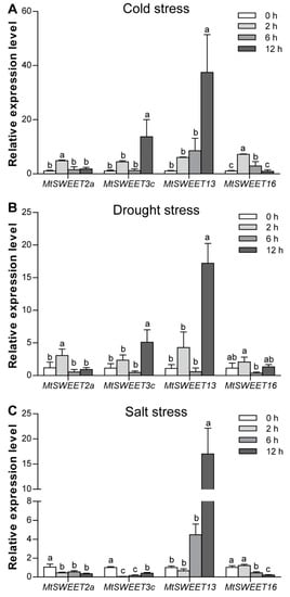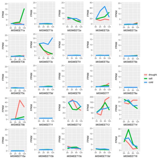 To assess the potential functions of the MtSWEET genes in response to abiotic stress in M. truncatula, their expression patterns under drought, salt and cold stresses were analyzed by high-throughput sequencing data [50]. In the transcriptome analysis using RNA-seq data, MtSWEET genes with FPKM values lower than 1 were considered to be barely expressed. The RNA-seq data indicated that 12 MtSWEET genes were responsive to the three abiotic stress conditions (Figure 6; Table S2). Under cold stress, two (MtSWEET2b and MtSWEET13) and four MtSWEET genes (MtSWEET1a, MtSWEET15c, MtSWEET15d, and MtSWEET16) were significantly up- and down-regulated at certain time points (|log2 fold change| ≥ 1), respectively (Figure 6; Table S2). A total of eight MtSWEET genes showed significant changes in their expression levels under drought stress, including four up-regulated genes (MtSWEET3a, MtSWEET3b, MtSWEET9b, and MtSWEET13) and another four down-regulated genes (MtSWEET1a, MtSWEET3c, MtSWEET15c, and MtSWEET16), while the expression of MtSWEET7 showed a decrease at 2 h but remarkable increases at 6 h and 12 h (Figure 6; Table S2). Under salt stress, five (MtSWEET1a, MtSWEET2b, MtSWEET7, MtSWEET9b, and MtSWEET13) and two MtSWEET genes (MtSWEET2a and MtSWEET3c) were significantly up-regulated and down-regulated, respectively, while the transcripts of MtSWEET15c and MtSWEET16 showed an obvious increase at 2 h but a sharp decrease at 12 h (Figure 6; Table S2). These results indicated that MtSWEET genes play important roles in the responses to different stress treatments.