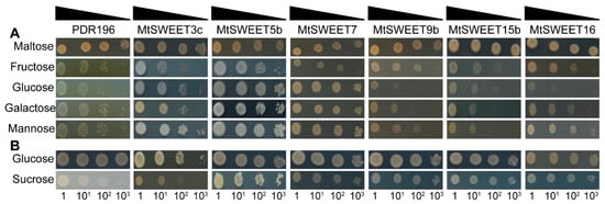 To investigate the sugar transport abilities of MtSWEET proteins, six MtSWEET genes were expressed in the yeast mutants of EBY.VW4000 and SUSY7/ura3. Compared with the transformants expressing pDR196, MtSWEET5b allowed the uptake of fructose, glucose, galactose, and mannose, MtSWEET7 enabled the uptake of glucose, galactose, and mannose but not fructose, while MtSWEET3c was able to restore the growth on the medium supplemented with glucose and mannose (Figure 8A). However, MtSWEET16 only enabled mannose uptake in the yeast EBY.VW4000 mutant (Figure 8A). In addition, MtSWEET5b, MtSWEET7, MtSWEET9b, MtSWEET15b, and MtSWEET16 conferred sucrose uptake in the yeast SUSY7/ura3 mutant (Figure 8B). These results revealed that MtSWEETs might be involved in plant growth by regulating the transport of sugars.