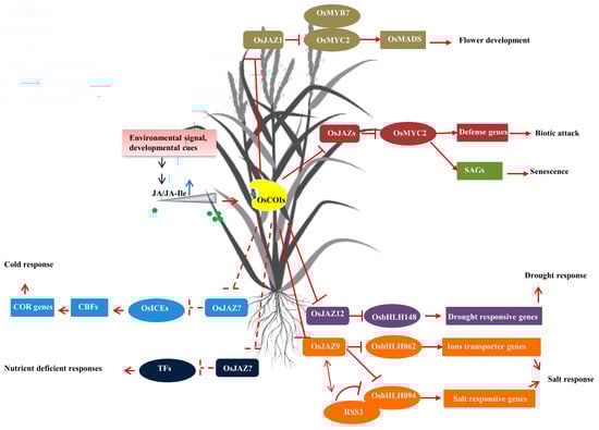 Beside important roles in drought, salt, and cold stress, in recent years, many reports have announced the involvement of jasmonates in response to nutrients starvation or modulated nutrient status in unfavorable conditions. Kobayashi et al. [] reported a rapid induction of genes involved in JA biosynthesis and signaling in the very early stages of iron deficiency in rice roots (Oryza sativa subsp. japonica cv Tsukinohikari). Accordingly, the endogenous level of JA and JA-Ile were increased rapidly in rice roots growth in Fe-inefficient conditions []. A comparison with the JA-deficient cpm2 mutant revealed that, in the wild type plant, jasmonates repress the expression of many iron deficiency-inducible genes involved in iron uptake and translocation under iron sufficiency, but this repression is partly canceled under an early stage of iron deficiency [], although the molecular basis of jasmonates signaling and the role of the OsJAZ proteins in iron deficiency response are elusive. However, based on these findings, a putative signaling module responding to JAZ proteins and the activator transcription factors likely exists, in which OsJAZ proteins act as a repressor of the activator transcription factor-mediated regulation of iron-deficiency-responsive genes. In fact, three bHLH transcription factors, OsIRO2, OsIRO3, and OsbHLH133 have been identified to be involved in the Fe deficiency response in rice []. Whereas, many OsJAZ genes have also been found induced in rice roots under macronutrients (N, P, K) and micronutrients (such as Cu, Fe, …)-deficient conditions []. It would be interesting to find out whether or not these basic helix-loop-helix transcription factors could interact with the OsJAZs protein.