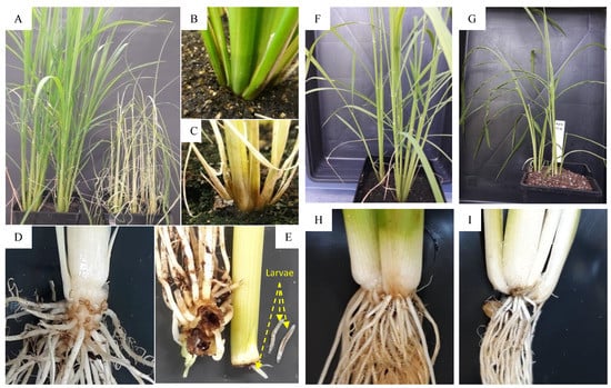 The JA biosynthetic osaoc mutant succumbs to attack by larval of the soil fly fungus gnats Bradysia spp. (Diptera: Sciaridae). In the greenhouse conditions, homogenous mutant plants (osaoc/osaoc) were planted next to the heterozygous and wild type plants in the soil. Larvae were able to attack to the stem of the homogenous mutants, result in wilting and plants dying after few days, while the wild type plants were just attacked on some roots and had no obvious symptoms on the above-ground part. The assay was repeated at least three times with the total observation of homozygous mutants of more than 100 plants. When a fly trap was applied, or the soil treated with larvacide (VectoBac), or 10 µM of JA applied through spraying on leaf or soil, the mutant plants were able to survive until flowering. The figure shows the wild type plants (A (plants on the left), B, and D) and the homozygous mutant plants (A (plants on the right), C, and E) with the wilting symptom on their leaves and the larvae found in the stem of attacked mutant plants. (F,H) Healthy heterozygous plants without insect attack. (G,I) Healthy osaoc mutant plants without insect attack.