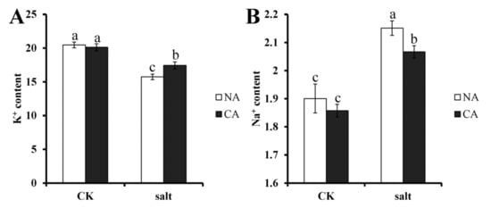 Ion content in bermudagrass under different treatments. (A). K+ content; (B). Na+ content. Mean values and standard deviation (SD) were calculated from three independent experiments. Different letters indicated significant difference (p < 0.05) based on one-way analysis of variance (ANOVA), Duncan’s multiple range test. Bars show SD. CK = control; NA = non-cold treatment; CA = pre-cold treatment for 6 h.