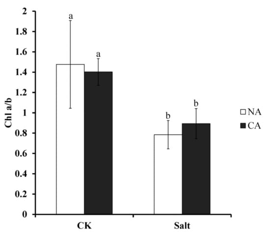 Chlorophyll (Chl) a/b ratio of bermudagrass under different treatments. Mean values and standard deviation (SD) were calculated from three independent experiments. Different letters indicate significant difference (p < 0.05) based on one-way analysis of variance (ANOVA), Duncan’s multiple range test. Bars show SD. CK = control; NA = non-cold treatment; CA = pre-cold treatment for 6 h.
