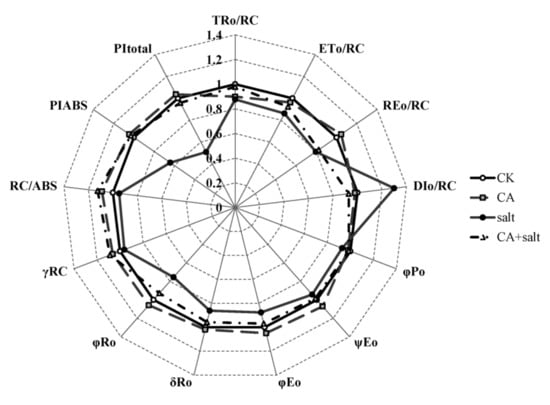 Excess salinity is one of the main environmental stresses limiting growth and development, productivity and distribution of plants throughout the world. Salt stress causes changes in a series of cellular processes, photosynthesis process and gene expression in plants [1,2,3]. For instance, salt stress inhibits plant growth and damages the cell membrane [4,5]. Previous studies have revealed that electrolyte leakage (EL) increased dramatically in perennial ryegrass (Lolium perenne) [6]. The Na+ was accumulated, while K+ content decreased in Arabidopsis [7]. The change of ion accumulation will affect the metabolic process further [8]. Simultaneously, the chlorophyll content decreased in plant under salt stress [9]. In response, the plants have evolved several mechanisms such as: cell membrane system, antioxidant system and photosynthetic system, in order to protect themselves against salt stress [9,10,11]. Photosynthesis is one of the most essential physiological processes in plants that are sensitive to salt stress [12]. When a leaf is exposed to dark conditions, distinguishable changes of chlorophyll a fluorescence intensity can be detected, referred to the Kautsky effect [13]. Information about the different redox states of PSII and efficiencies of electron transfer in the photosynthetic electron transfer chain is contained in Chl a fluorescence transient [14]. For this reason, chlorophyll fluorescence analysis is widely used in plant physiology studies [15]. Generally, when Chl a fluorescence transient is plotted on a logarithmic time scale, four steps known as O-J-I-P could be clearly observed [13]. The four steps reflect different reactions in the photosynthetic pathway. Generally, the reaction centers (RCs) are totally open at O step, so the highest photochemistry yield and minimal Chl a fluorescence yield are measured. At the O-J step, the primary quinone electron acceptor QA was reduced to QA−; the J-I-P steps reflect the reduction of PQ pool; and the RCs are totally closed at P step, so the maximal fluorescence yield is measured. It was reported that the energy flux and electron transport were hindered in Brassica juncea by salt stress [16].