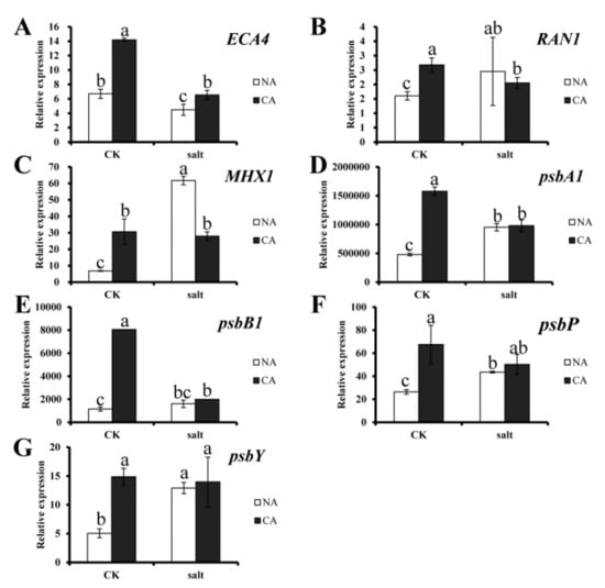 Expression of candidate genes in bermudagrass under different treatments. (A) ECA4 gene expression; (B) RAN1 gene expression; (C) MHX1 gene expression; (D) psbA1 gene expression; (E) psbB1 gene expression; (F) psbP gene expression; (G) psbY gene expression. Quantitative real-time PCR was repeated three times. One-way analysis of variance (ANOVA), Duncan’s multiple range test was used to determine statistical differences. Bars show SD.