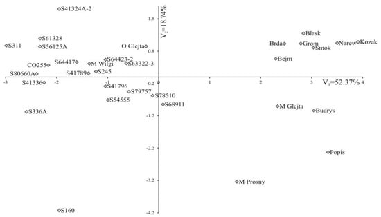 Individual traits are of differing importance and represent different proportions in the joint multivariate variation. Analysis of the multivariate genotypic variation also includes identification of the most important traits in the multivariate variation of genotypes. Analysis of canonical variables is a statistical tool that makes it possible to solve the problem of multivariate relationships. The first two canonical variables jointly explain 71.11% of the total variation between genotypes (Figure 1).
