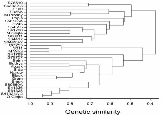 In recent years, methods have been sought to allow initial selection of lines intended for heterosis crossing. The dependence of the heterosis effect on genetic distance, as determined using molecular markers, has been analyzed by many researchers in various species, including [], pepper [], cocoa [], barley or sunflower []. Factors associated with the hybrid heterosis effect resulting from the crossing of inbred maize lines were discovered in 1992 []. Research conducted using molecular RFLP markers on 148 inbred lines of maize supported the use of these markers when the breeding material was clustered into heterotic groups []. The AFLP system was used to select parental components for maize heterosis crosses []. Five primer pairs generated 56 polymorphic bands, allowing the degree of similarity to be determined, which was then correlated with the effect of heterosis. Shehata et al. [] demonstrated the usefulness of the SSR system in assessing the genetic distance of eight inbred maize lines. Berilli et al. [] studied the genetic distance between two maize populations (CYMMYT and Piranao), which was estimated using molecular ISSR markers. Thirteen primers generated as many as 140 products, of which 84.4% were polymorphic. The genotypes tested were divided into two main groups, which contained mainly individuals from a single population.