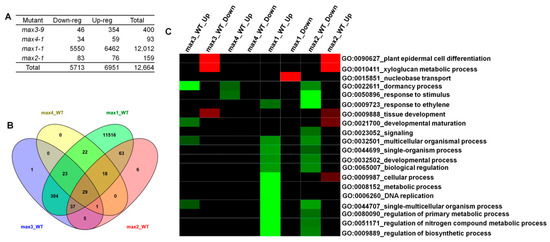 2.2. Microarray Analysis Revealed Differentially Expressed Genes (DEGs) in max Mutants and the Role of Those Genes in the Biological Process
