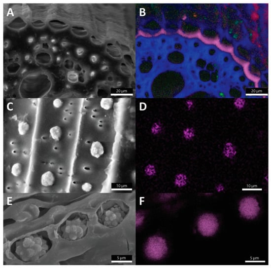 Three modes of silicification in roots investigated by scanning electron microscopy (A,C,E) coupled with X-ray microanalysis (B,D,F), where Si is visualized by pink color. Impregnation of endodermal cell walls is typical for wheat (Triticum) (A,B). Silica aggregates/phytoliths associated with inner tangential cell walls of endodermis are shown in Sorghum bicolor (C,D). Specific stegmata cells filled with silica aggregates/phytoliths occur in Phoenix dactylifera (E,F).