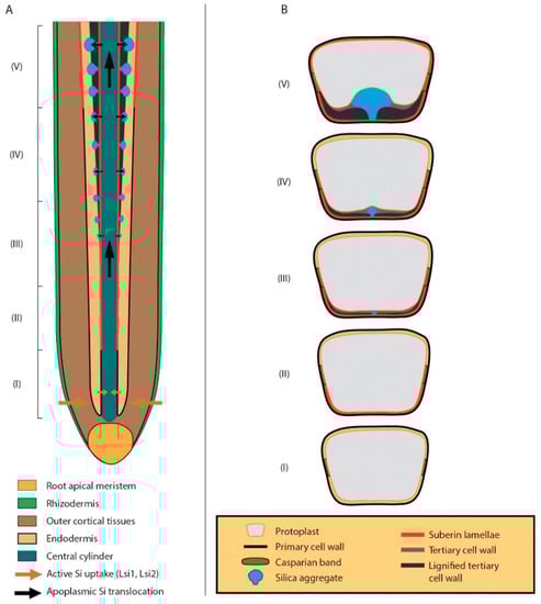 Silica deposition in root endodermis of Sorghum bicolor [,] modified; with permission from Annals of Botany journal. (A) A longitudinal section of root showing transport and deposition of silica in endodermal cells. (B) A scheme of silica deposition in a single endodermal cell. I—Endodermal cell with primary cell wall and Casparian strip. II—Suberin lamellae deposition at the inner tangential cell wall. III–IV—Simultaneous deposition of tertiary inner tangential cell wall and the growth of a silica aggregate. Tertiary cell wall grows centripetally as an extending matrix of cellulosic and non-cellulosic polysaccharides that is progressively impregnated by the deposition of various polyphenolic substances polymerizing into lignin. The growth of silica phytolith initiates in a spot predetermined probably by a patchy pattern of lignin polymerization or a local difference in the composition of its constituents. IV—Development of the tertiary cell wall continues and promotes further growth of the silica phytolith. V—The growth of silica phytolith arrests with the end of tertiary cell wall development.