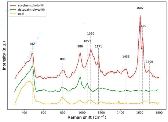 Representative Raman spectra of silica phytoliths isolated from endodermal cells of Sorghum bicolor seminal roots (red) and from the root stegmata of Phoenix dactylifera (green) [] (modified). Opal spectrum (yellow) is displayed as a reference. All spectra display two broad and asymmetrical bands in the regions 400–490 and 780–820 cm−1 underlining the amorphous nature of the silica.