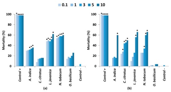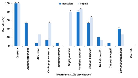 Mortality of 2nd instars when exposed to extracts of pesticidal plant either topically applied through a contact toxicity bioassay or through ingestion in a feeding bioassay. Treatments different from the untreated control (p < 0.05) are indicated by *. Significant differences are presented in Table S1.