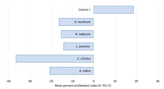 All of the five plant extracts used in this trial showed some degree of deterrence (Figure 3). The most potent feeding deterrents were C. citratus and A. indica. Although mortality appears to be relatively low with these two species, feeding deterrent compounds could help to reduce crop damage. In agreement with our observations, other studies demonstrated the deterrent effects of several Cymbogon species as well as A. indica. In a binary choice test, the essential oils isolated from C. nardus, C. flexuosus and C. martini exhibited strong antifeedant activity against Acharia fusca and Euprosterna elaeasa [24]. The antifeedant properties of A. indica are well established, particularly for a range of lepidopteran pests [25,26,27].