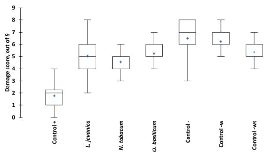 Fall armyworm damage to maize plants when exposed to different treatments over eight weeks. Boxes represent mean and 95% confidence intervals, tails are max. and min. values, blue crosses are median values. Significant differences are presented in Table S1.