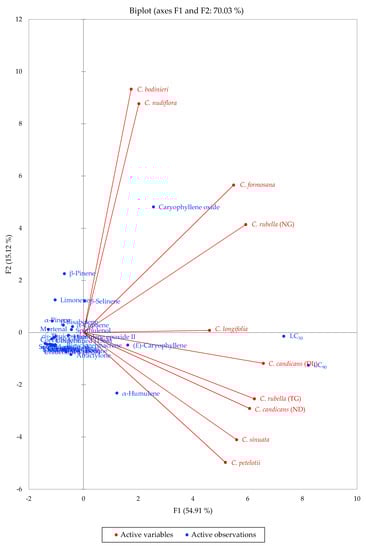Principal component biplot of PC1 and PC2 scores and loadings indicating the correlation of chemical components of Callicarpa essential oils from central Vietnam and Aedes aegypti larvicidal activity.