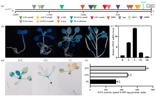To further investigate the expression of PtFLC, a 1.6 Kb promoter fragment from the translation start site (TSS) of PtFLC (proPtFLC) was amplified from trifoliate orange and analyzed by using PLACE software [25]. Several common elements were found, such as a TATA box, CAAT box, and the putative transcriptional start site. Meanwhile, some putative cis-acting regulatory elements involved in plant hormone-response, stress-response, light-response, and circadian control were also predicted (Figure 2a and Supplementary Table S1), implying that proPtFLC may responsed to various environmental factors. To precisely define the spatial expression pattern of proPtFLC, proPtFLC was fused to the β-glucuronidase (GUS) gene and transformed into wild-type Arabidopsis. More than 20 transgenic lines were created, which mostly showed similar GUS expression patterns. At the juvenile stage, stronger GUS staining could be detected in the whole plants (Figure 2b). Along with the growth of seedlings, although the GUS signal was present in whole plants at the adult stage, the expression was weakened compared with the juvenile stage (Figure 2b). Further analysis of GUS expression in different tissues of transgenic plants showed that GUS staining was found in roots, leaves, stems, flowers, silique pods, and mature seeds (Figure 2b). These results agree with the real-time PCR results of PtFLC expression in different citrus tissues (Figure 2c). To investigate whether the promoter activity could be induced by low temperature, seedlings were grown at 4 °C and 15 °C for 1 week in long-day conditions, and then transferred to under long-day conditions at 25 °C (Figure 2d,e). The data showed that GUS activity was decreased after low-temperature treatment. It seems that proPtFLC was inhibited by low-temperature treatment.