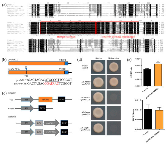 PtHB13 directly binds to the promoter of PtFLC. (a) Sequence analysis of PtHB13 protein with its homolog protein. PtHB13 from Citrus trifoliate, MDP0000423596 from Malus domestica, Potri.010G093400.1 from Populus trichocarpa, Ciclev10032279m from Citrus clementina, AT1G69780.1 from Arabidopsis, Zm00008a000472 T01 from Zea mays, and Os03g07450.1 from Oryza sativa. Heavy red line indicates conserved domain of these proteins. (b) Schematic diagrams of proPtFLC and constructs of yeast one-hybrid assay. proFLC indicates the promoter fragment containing a bZIP910 site, while proFLCm is mutated form of proFLC. (c) Schematic diagrams of effector and reporter vectors for dual luciferase reporter assay. (d) Growth of yeast cells co-transformed with prey and bait on selective medium. proFLC1 contains a bZIP910, while proFLC contains a mutated form of bZIP910 site; (e) Transient expression assay of promoter activity using tobacco cells co-transformed with effector and reporters. Error bars represent ± SE (n = 3); asterisks indicate significant differences (Student’s t-test): ** P < 0.01.