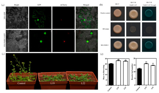 Functional analysis of PtHB13 in Arabidopsis. (a) PtHB13-GFP localization in tobacco cells; (b) Transcriptional activation analysis of PtHB13. Yeast cells carrying pBD-PtHB13 vector, pGBKT7, or positive control (pCL) were streaked on SD/-Trp medium or SD/-Trp/-His plates supplemented with x-α-gal. (c) Phenotypes of PtHB13 transgenic Arabidopsis and control. (d) Number of days and leaves to flowering for two PtHB13 transgenic lines. Asterisks indicate significant differences (Student’s t-test): ** P < 0.01.