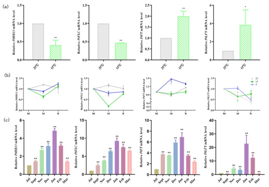 2.5. PtFLC and PtHB13 Are Regulated by Low-Temperature Changes in Citrus