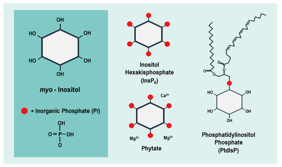 Simplified structures of myo-inositol, InsP6, phytate, and PtdInsP. Inorganic phosphate (Pi) groups, covalently bound to the myo-inositol ring by an oxygen molecule, are represented in red. For simplification purposes, this figure does not take into account the axial and equatorial positions of the moieties.