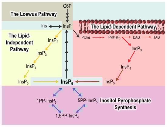 InsP6 can be synthesized by two interconnected pathways in plants. The pathways are named for their starting material: the Lipid-Dependent pathway and the Lipid-Independent pathway (Figure 3). The Lipid-Dependent pathway is present in all eukaryotic organisms [21,22,23,24,25]. The Lipid-Independent pathway for synthesizing InsP6 was originally discovered in Dictyostelium in a landmark paper by Stephens and Irvine in 1990, and followed up on in Spirodela polyrhiza [26,27]. This pathway was thought be unique to these organisms, along with land plants. However, a very recent publication by Desfougères et al. shows that the Lipid-Independent pathway is also present in mammals [28]. This work is the first to report evidence of the Lipid-Independent pathway in mammals and will be crucial for exploring the evolution of enzymes across organisms.