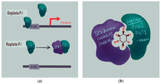 Model depicting how PP-InsPs regulate plant Pi sensing and the Pi starvation response (PSR). (a) PSR gene regulation under deplete (top) and replete Pi conditions (bottom). SPX1 binds to PHR1 under replete Pi, preventing SPX1 from binding to promoters containing P1BS. Under deplete Pi, PHR1 is uninhibited from binding to P1BS promoters. Adapted from [60]. (b) Model depicting a complex formation between SPX1, PHR1, and InsP8. This model represents interactions between other SPX proteins and PSR regulators, such as PHR1 and its homolog, PHT1, along with others.